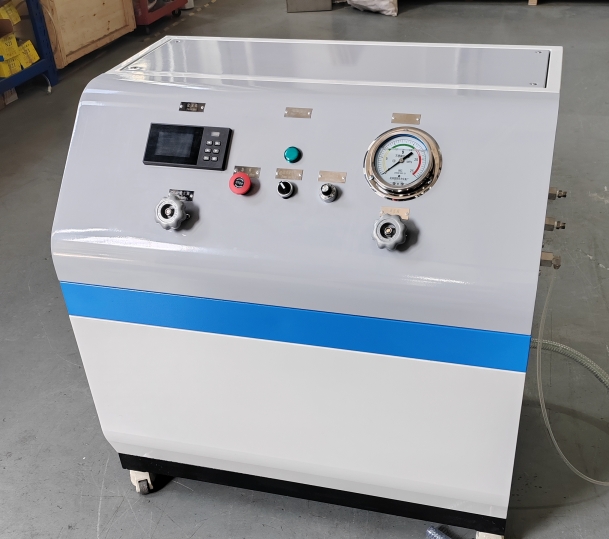 氣瓶?jī)?nèi)水壓試驗(yàn)機(jī)(鋼瓶?jī)?nèi)測(cè)法水壓試驗(yàn)機(jī))壓力范圍0~45mpa,介質(zhì)為靜止的清水,系統(tǒng)內(nèi)置高壓泵,實(shí)現(xiàn)對(duì)壓力高的高壓打壓,高壓保壓,高壓泄壓的測(cè)試效果,具體的測(cè)試步驟為:注水→打壓→保壓→泄壓→輸出數(shù)據(jù)的過(guò)程。”是用于針對(duì)鋼瓶,氣瓶,非標(biāo)纏繞瓶,軍工纏繞瓶的內(nèi)水壓測(cè)試的范式,壓力范圍:0.1~45Mpa,介質(zhì)為靜置的液體,采用思明特增壓泵完成對(duì)壓力的增壓,計(jì)算機(jī)壓力控制系統(tǒng)控制壓力和控制增壓速率。